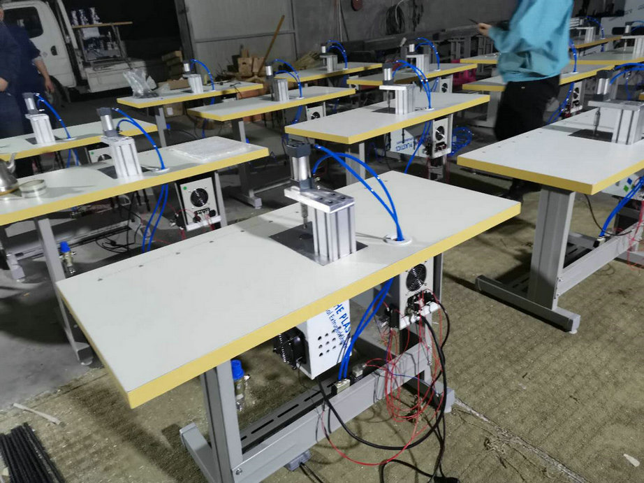 本機以超聲波將綁帶融合于口罩本體兩側,進而完成綁帶式口罩成品,只需一名操作員將口罩片置于超聲波發(fā)生器的頭上,后將綁帶放在口罩片上,腳踏踏板使氣缸向下運動,縫住綁帶和口罩片。